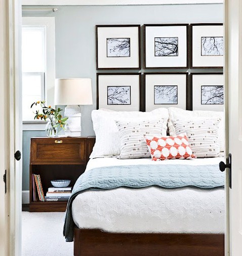 LOVE the framed black and white photos hung over the bed.